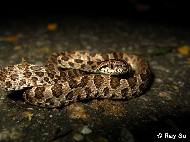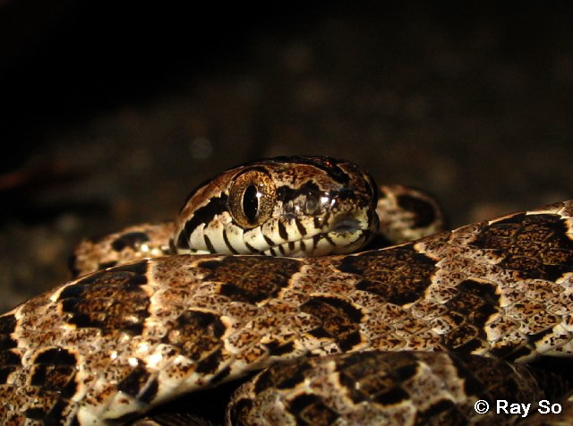 | Description | Black greyish or yellowish with large dark brown spots and blotches. Ventrals whitish. Body long and slender, prominently ridged, with a row of enlarged vertebral scales. Head triangular with an arrow-shaped marking above. Upper jaw with two enlarged teeth at the back; Labials light-coloured. Tail long and thin. Scale smooth and obliquely shaped. Mildly venomous, not dangerous to humans. |