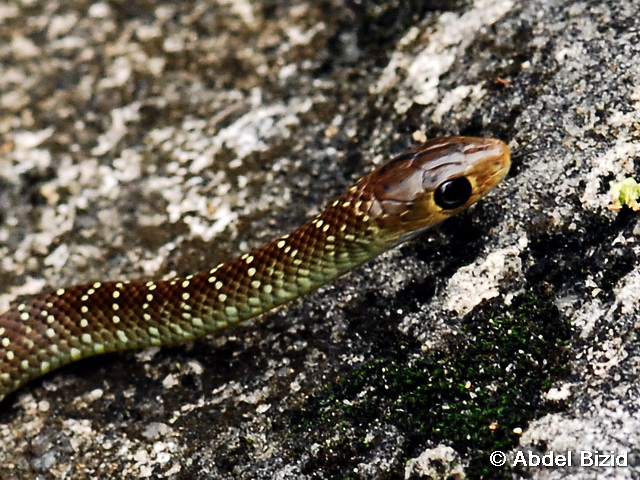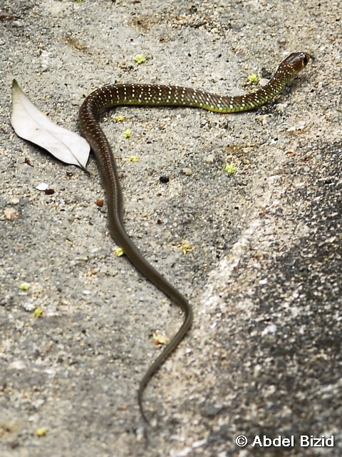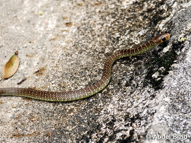 | Description | Back Olive-brown or brown with dark longitudinal brown line across each scale, appear like thin brown stripes along entire body. Juveniles olive brown, with white dots forming transverse crossbands on anterior part of body. The bands disappear in adults. Ventrals and chin scales yellowish white. Tail long and whip-like. Scales smooth. |